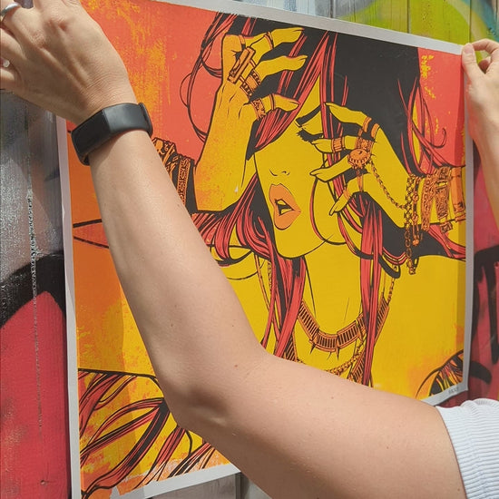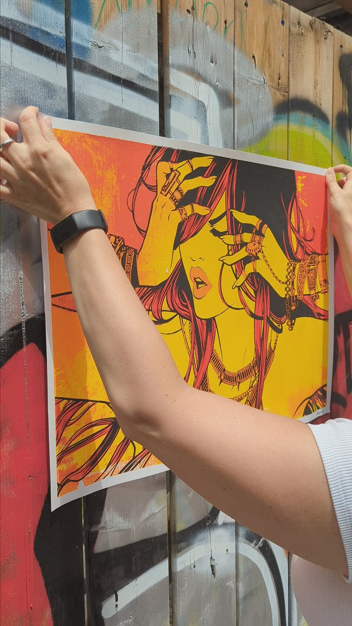One of my signature pieces, featuring Scherezade, the protagonist of my self published comic book "1001." This is a fully hand printed artwork: each color mixed with care and printed by hand using the silkscreen process.